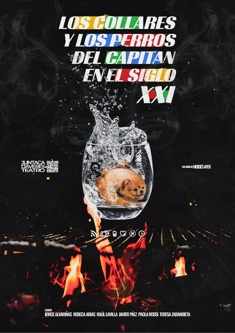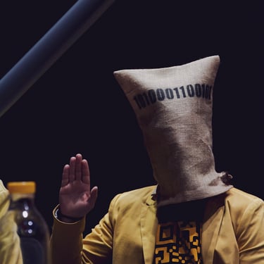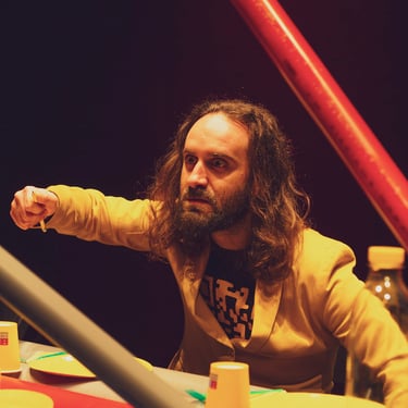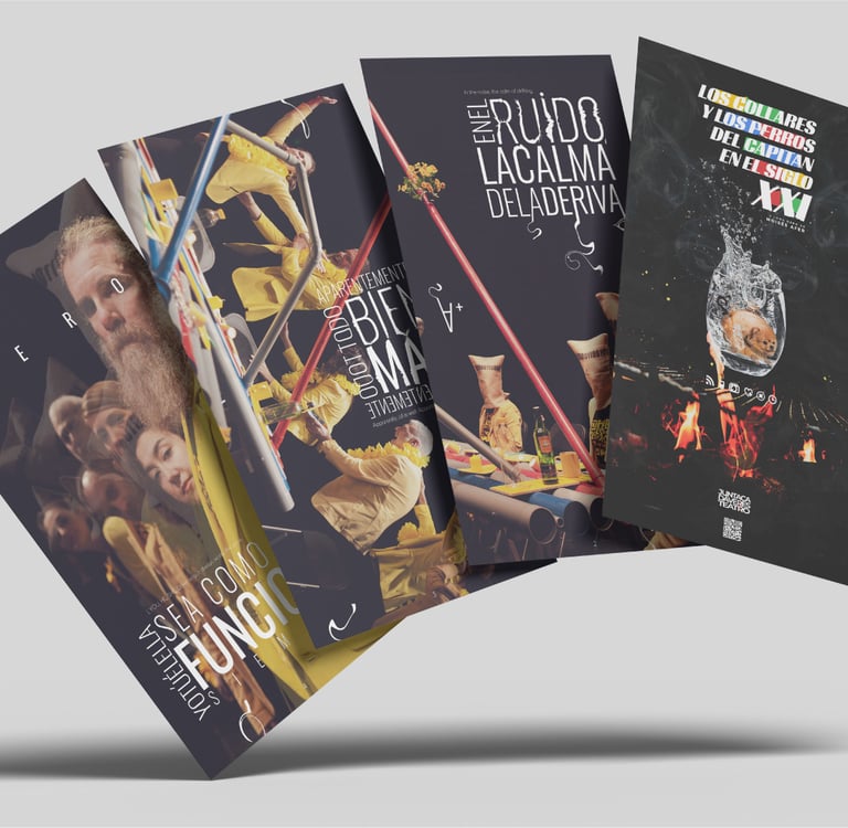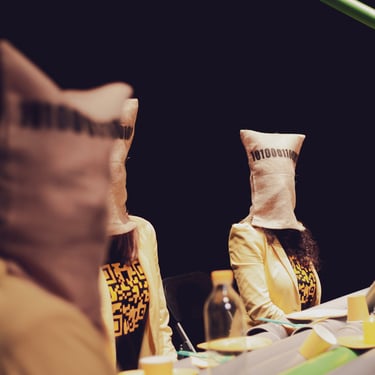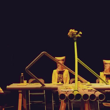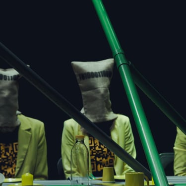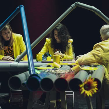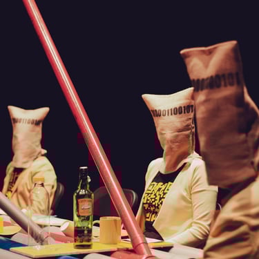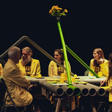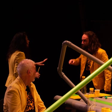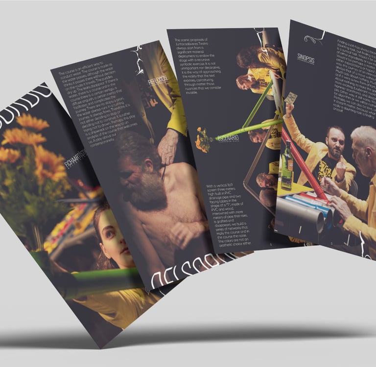 Las propuestas escénicas de Juntacadáveres Teatro siempre parten de un importante despliegue material para dotar al escenario de un recursivo ejercicio simbólico. No es auxiliar, no es decorativo, es un modo de aproximación a la realidad que el texto expone, caricaturizando por medio de la materia aquellos matices que estimamos invisibles. Con una pantalla vertical 16:9 de tres metros de altura construida en tubería de desagüe PVC y dos mesas enfrentadas en forma de “T”, realizadas también en tubería de PVC y madera, entrelazadas con más metros de tubo que sube, se injerta y desaparece, construimos una serie de redes que implican el cauce y en el cauce el ruido. Los colores tampoco son una elección estética. Granjas de datos para saber qué seremos.