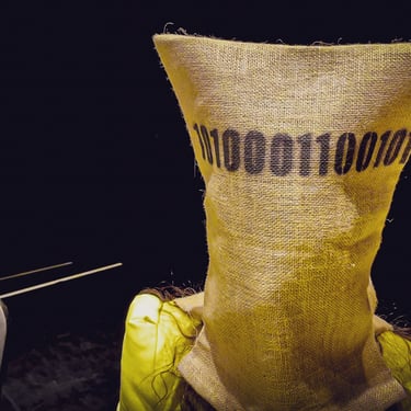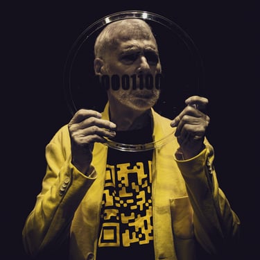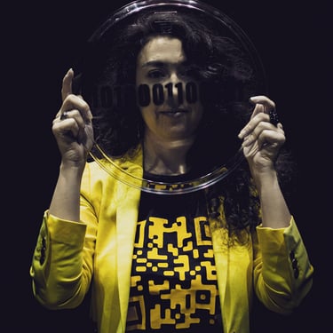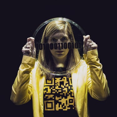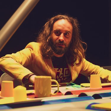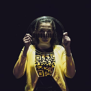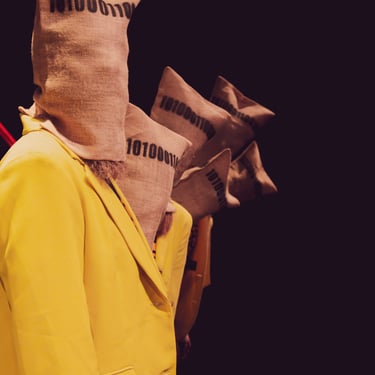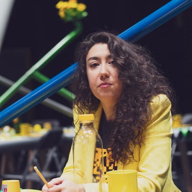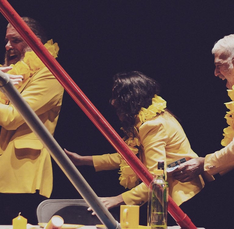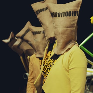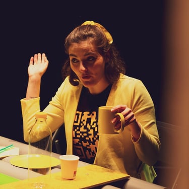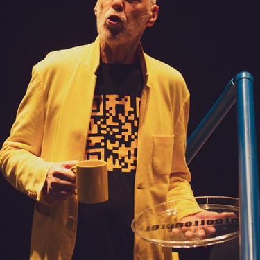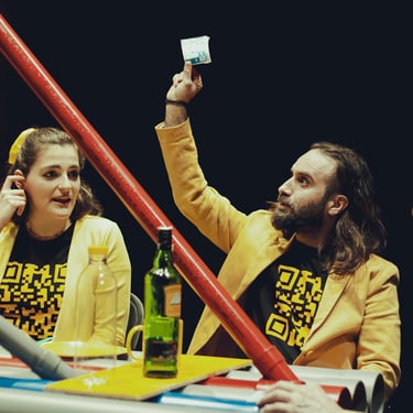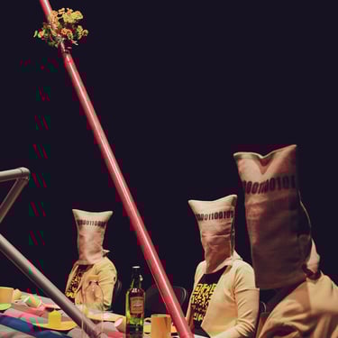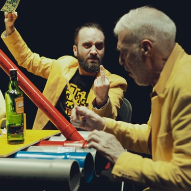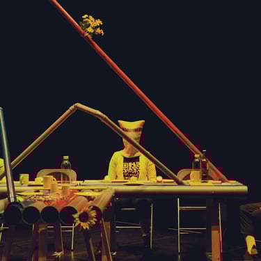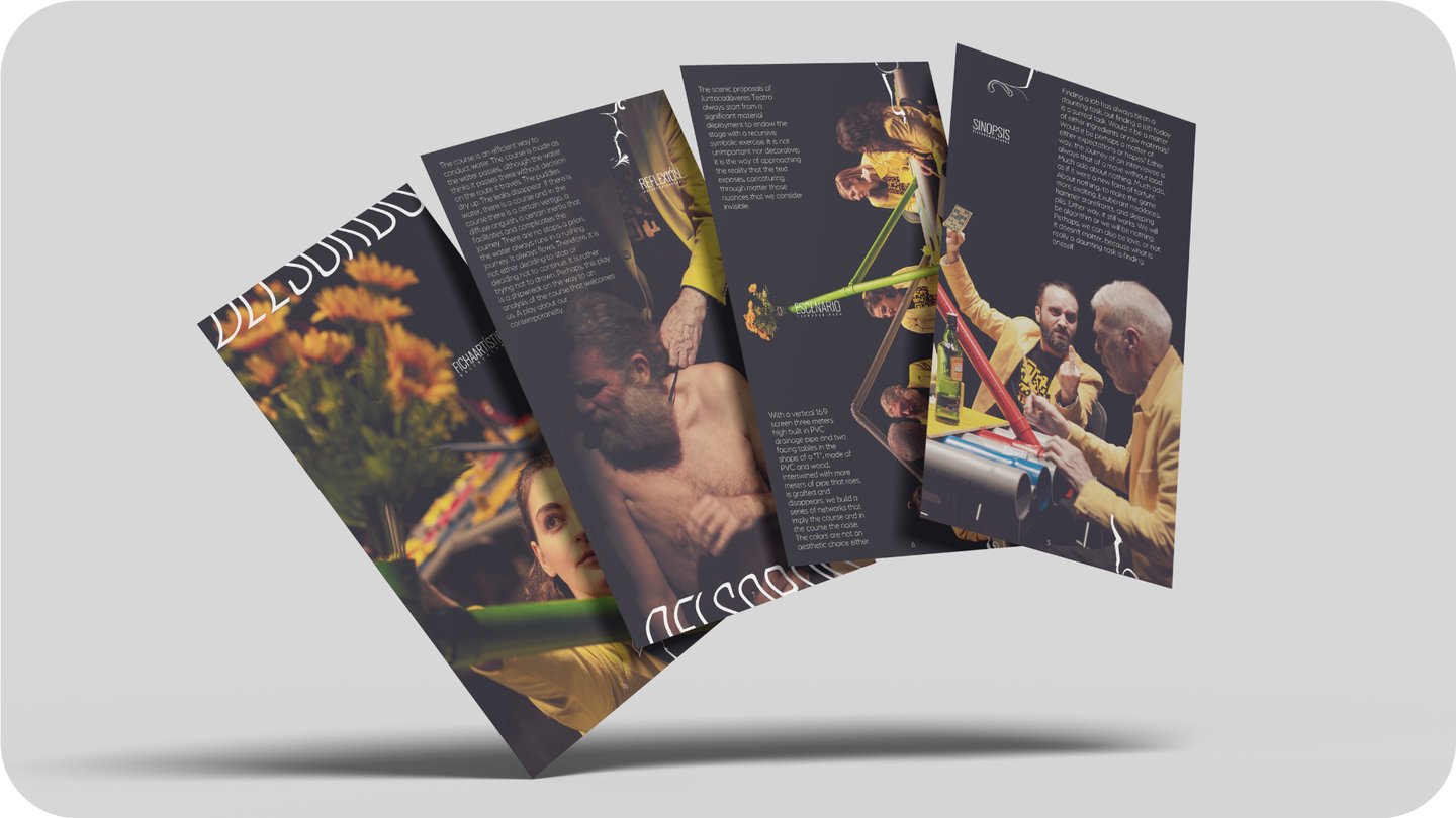 Las propuestas escénicas de Juntacadáveres Teatro siempre parten de un importante despliegue material para dotar al escenario de un recursivo ejercicio simbólico. No es auxiliar, no es decorativo, es un modo de aproximación a la realidad que el texto expone, caricaturizando por medio de la materia aquellos matices que estimamos invisibles. Con una pantalla vertical 16:9 de tres metros de altura construida en tubería de desagüe PVC y dos mesas enfrentadas en forma de “T”, realizadas también en tubería de PVC y madera, entrelazadas con más metros de tubo que sube, se injerta y desaparece, construimos una serie de redes que implican el cauce y en el cauce el ruido. Los colores tampoco son una elección estética. Granjas de datos para saber qué seremos.